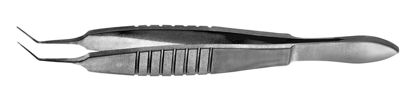 Angled, 7.5mm long smooth jaws; diagonal groove for grasping IOL haptic